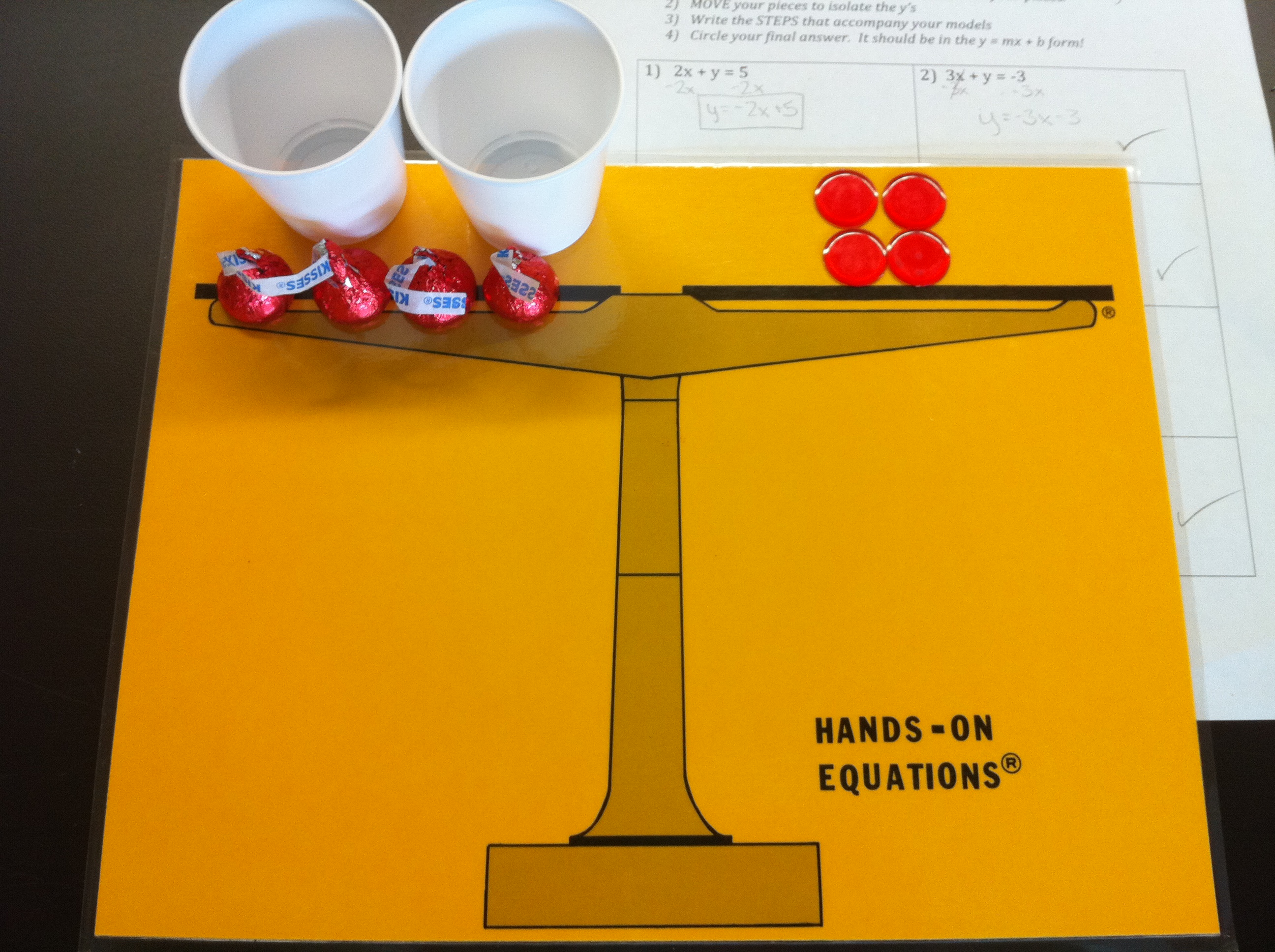 So, what do you do when you mess up and want to make it right?  Well, give them candy of course!  ; )  Thanks to an amazing brainstorming session with the wonderful, brilliant teachers on Twitter a new plan was devised.  We would solve for y in the style of “Hands On Equations” with small Solo cups, Hershey kisses, and integer counters.