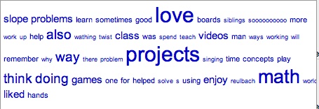 I enjoyed seeing the words love, math, and projects.  The projects jumped right out at me!  This is my first time teaching in a project intensive school.  This Word Cloud zeros in the fact that students are feeing a love of math in my class, and it is because of the projects that I have created.  Since my goal is for all students to love math, I obviously need to get busy and create more projects.